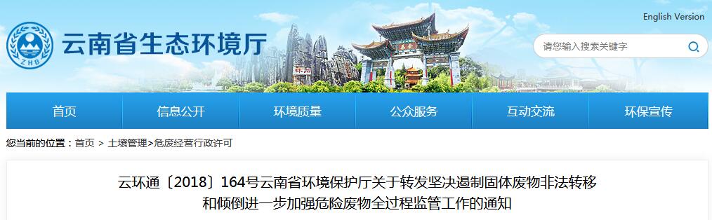 日前,云南省環(huán)保廳發(fā)布了關于轉(zhuǎn)發(fā)堅決遏制固體廢物非法轉(zhuǎn)移和傾倒進一步加強危險廢物全過程監(jiān)管工作的通知,詳情如下:各州、市環(huán)境保護局:現(xiàn)將生態(tài)環(huán)境部《關于堅決遏制固體廢物非法轉(zhuǎn)移和傾倒進一步加強危險廢物全過程監(jiān)管的通知》(環(huán)辦土壤函〔2018〕266號)轉(zhuǎn)發(fā)你們。同時,就我省開展嚴厲打擊固體廢物非法轉(zhuǎn)...