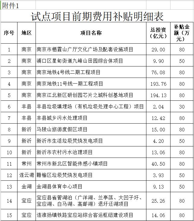 日前,江蘇省發(fā)布了關(guān)于下達(dá)2018年度第二批PPP項(xiàng)目獎(jiǎng)補(bǔ)資金的通知,涉及多個(gè)污水處理項(xiàng)目和生活垃圾焚燒發(fā)電項(xiàng)目。詳情如下:關(guān)于下達(dá)2018年度第二批PPP項(xiàng)目獎(jiǎng)補(bǔ)資金的通知 蘇財(cái)金〔2018〕135號(hào)南京市、徐州市、豐縣、新沂市、常州市、連云港市、金湖縣、寶應(yīng)縣、高郵市、丹陽(yáng)市、泰州市、興化市、宿...