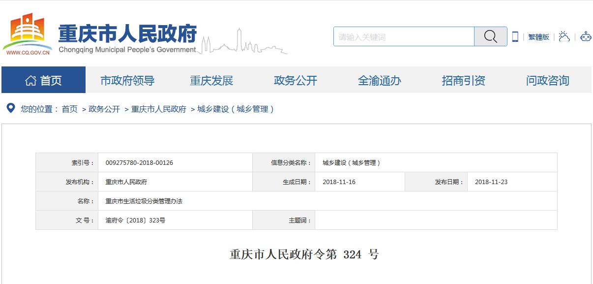 日前,重慶市政府發(fā)布了《重慶市生活垃圾分類管理辦法》,詳情如下:重慶市人民政府令第 324 號《重慶市生活垃圾分類管理辦法》已經(jīng)2018年11月1日市第五屆人民政府第30次常務(wù)會議通過,現(xiàn)予公布,自2019年1月1日起施行。市 長 唐良智2018年11月16日(此件公開發(fā)布)重慶市生活垃圾分類管理辦...