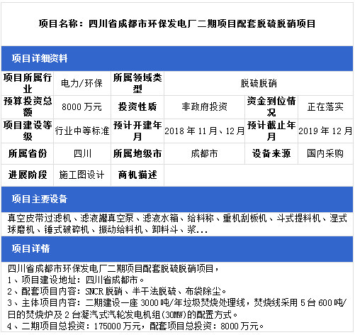 中項網(wǎng)獨家授權(quán)北極星環(huán)保網(wǎng)發(fā)布最新脫硫脫硝項目(2018年11月14日更新),涉及環(huán)保電廠配套脫硫脫硝項目、生物質(zhì)發(fā)電配套脫硫脫硝項目、熱電聯(lián)產(chǎn)脫硫脫硝項目、垃圾焚燒發(fā)電廠脫硫脫硝項目等,具體項目信息如下: