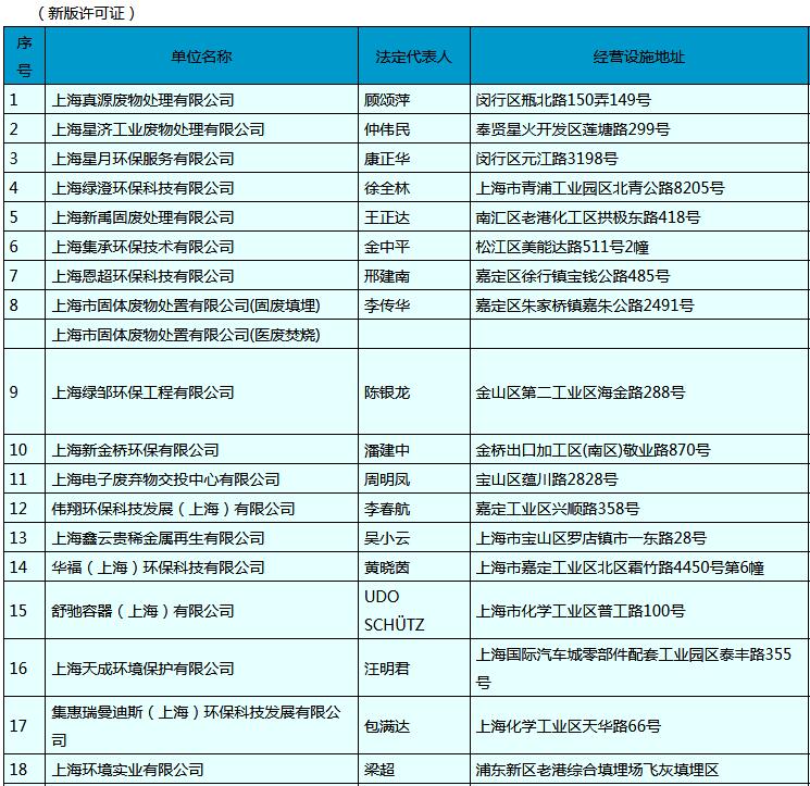 11月7日,上海環(huán)保局發(fā)布了《危險廢物經(jīng)營許可證名單》,共計26家企業(yè),詳情如下: