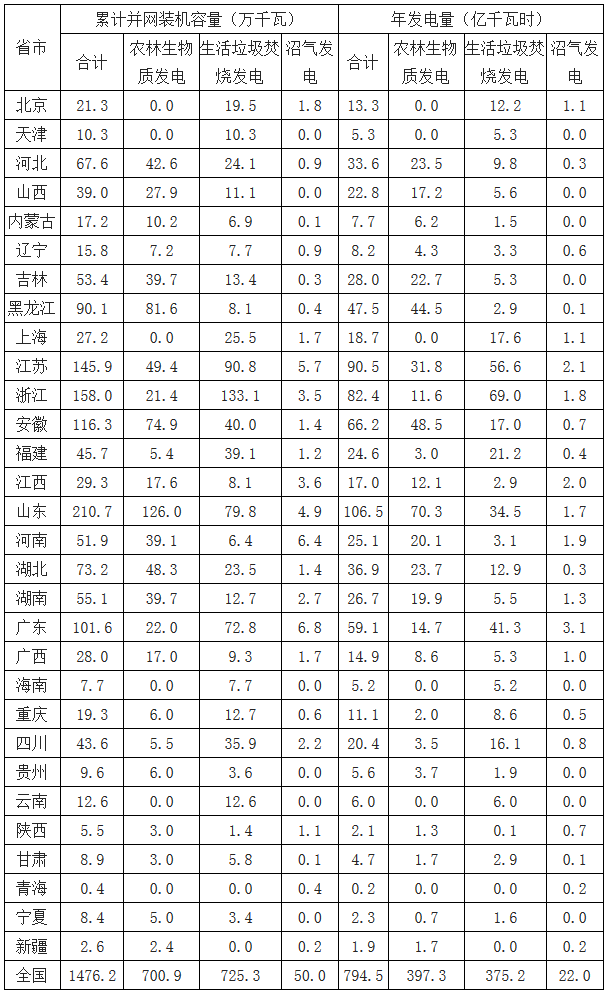 在各種政策的支持下,我國在生物質能發(fā)電領域取得了重大進展。截至2017年底,全國共有30個省(區(qū)、市)投產了747個生物質發(fā)電項目,并網(wǎng)裝機容量1476.2萬千瓦(不含自備電廠),年發(fā)電量794.5億千瓦時。其中農林生物質發(fā)電項目271個,累計并網(wǎng)裝機700.9萬千瓦,年發(fā)電量397.3億千瓦時;生...