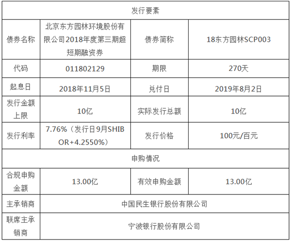 11月5日東方園林發(fā)布了《東方園林超短期融資券發(fā)行情況公告》,具體內(nèi)容如下:北京東方園林環(huán)境股份有限公司超短期融資券發(fā)行情況公告證券代碼:002310股票簡稱:東方園林公告編號:2018-163本公司及董事會全體成員保證信息披露的內(nèi)容真實、準確、完整,沒有虛假記載、誤導性陳述或重大遺漏。北京東方園林...