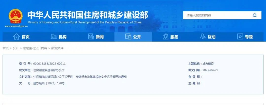 住房和城鄉(xiāng)建設(shè)部辦公廳關(guān)于進(jìn)一步做好市政基礎(chǔ)設(shè)施安全運(yùn)行管理的通知建辦城函〔2022〕178號(hào)各省、自治區(qū)住房和城鄉(xiāng)建設(shè)廳,北京市城市管理委、園林綠化局、水務(wù)局,天津市城市管理委、水務(wù)局,上海市住房和城鄉(xiāng)建設(shè)管委、綠化和市容管理局、水務(wù)局,重慶市住房和城鄉(xiāng)建設(shè)委、經(jīng)濟(jì)和信息化委、城市管理局,海南省水...