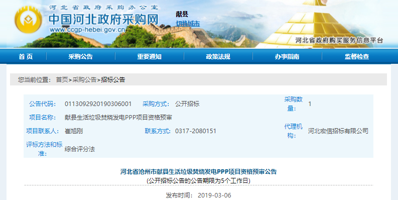 中國環(huán)聯(lián)網(wǎng)獲悉,3月6日,河北省滄州市獻縣生活垃圾焚燒發(fā)電PPP項目發(fā)布資格預審公告。本項目中主要建設內(nèi)容為:2×300t/d機械爐排爐+1×12MW凝汽式汽輪發(fā)電機組;配套建設垃圾接受與儲存系統(tǒng)、垃圾焚燒系統(tǒng)、余熱發(fā)電系統(tǒng)、煙氣凈化處理系統(tǒng)、灰渣處理系統(tǒng)、水處理系統(tǒng)等。本項目采用PPP運作方式中的...