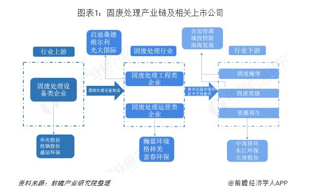 我國固廢處理行業(yè)已經(jīng)形成了較為成熟的產(chǎn)業(yè)鏈,其中上游行業(yè)為固廢處理裝備制造;中游行業(yè)按照公司主營業(yè)務類別不同可以分為固廢處理工程類企業(yè)和固廢處理運營類企業(yè);下游行業(yè)為固廢處置衍生行業(yè),主要分為固廢掩埋、固廢焚燒和資源再生。上游行業(yè)較為成熟,為固廢處理行業(yè)打下良好的基礎;中游行業(yè)參與者多為上市公司,行...