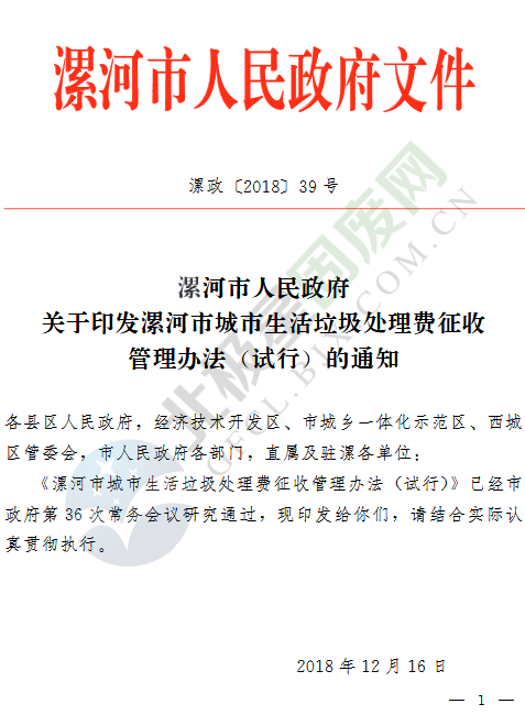 日前,《漯河市城市生活垃圾處理費征收管理辦法(試行)》已經(jīng)河南漯河市政府第36次常務會議研究通過,并于2019年1月1日起試行?!朵鸷邮谐鞘猩罾幚碣M征收管理辦法(試行)》是對《漯河市城市生活垃圾處理費計收管理暫行辦法》(漯政〔2005〕73號)的完善修訂。具體內(nèi)容如下:漯河市城市生活垃圾處理費...
