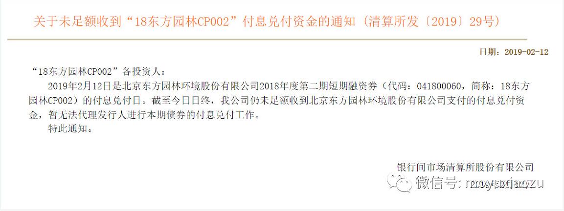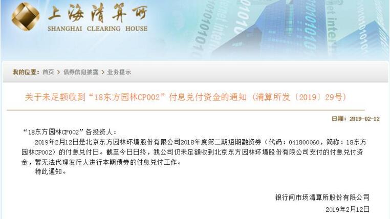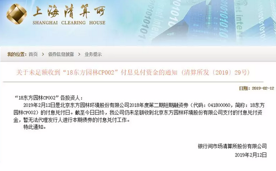 因?yàn)槎倘谌茨苋缙趦陡?,再次讓市場神?jīng)繃緊。2月12日下午,銀行間市場清算所股份有限公司(簡稱上海清算所)公告稱,2月12日是北京東方園林環(huán)境股份有限公司2018年度第二期短期融資券“18東方園林CP002”的付息兌付日。截至日終,仍未足額收到東方園林支付的付息兌付資金,暫無法代理發(fā)行人進(jìn)行本期債券...