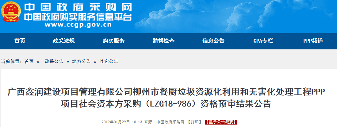 廣西鑫潤(rùn)建設(shè)項(xiàng)目管理有限公司受柳州市市容管理局 委托,根據(jù)《中華人民共和國(guó)政府采購(gòu)法》等有關(guān)規(guī)定,現(xiàn)對(duì)廣西鑫潤(rùn)建設(shè)項(xiàng)目管理有限公司柳州市餐廚垃圾資源化利用和無(wú)害化處理工程PPP項(xiàng)目社會(huì)資本方采購(gòu)(LZG18-986)資格預(yù)審公告進(jìn)行其他招標(biāo),歡迎合格的供應(yīng)商前來(lái)投標(biāo)。項(xiàng)目名稱(chēng):廣西鑫潤(rùn)建設(shè)項(xiàng)目管理有...