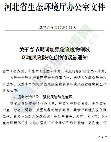 近日,河北省生態(tài)環(huán)境廳發(fā)布了關(guān)于春節(jié)期間加強(qiáng)危險(xiǎn)廢物領(lǐng)域環(huán)境風(fēng)險(xiǎn)防控工作的緊急通知,要求加大涉危險(xiǎn)廢物領(lǐng)域重點(diǎn)行業(yè)企業(yè)的環(huán)境監(jiān)管力度,2月份,全省暫停實(shí)施跨界危險(xiǎn)廢物轉(zhuǎn)運(yùn),特殊情況必須轉(zhuǎn)移的,一事一報(bào)。詳情如下:
