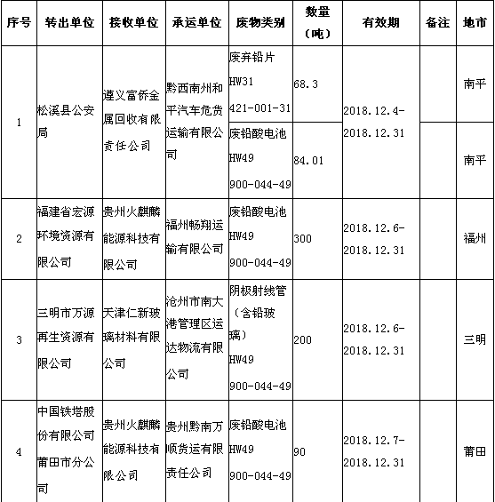 日前福建省環(huán)境保護(hù)廳發(fā)布了《2018年12月福建省危險廢物跨省轉(zhuǎn)移情況公告》,共有24項(xiàng),具體內(nèi)容如下: