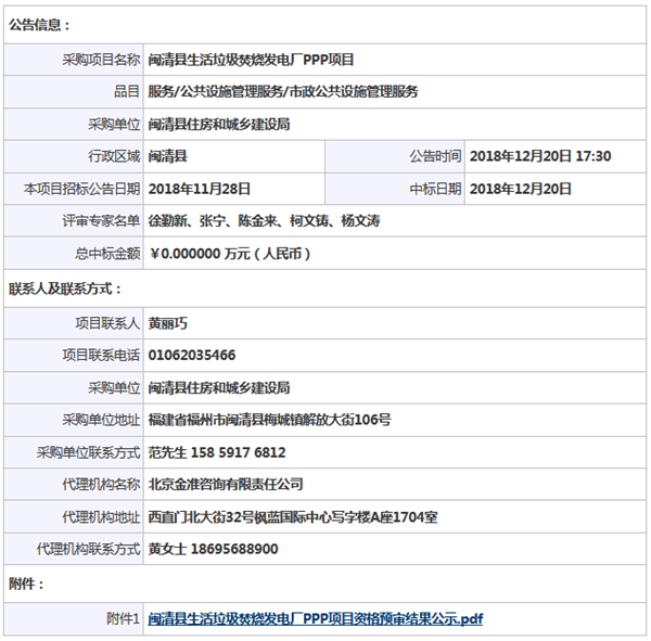 北京金準咨詢有限責(zé)任公司受閩清縣住房和城鄉(xiāng)建設(shè)局的委托,就“閩清縣生活垃圾焚燒發(fā)電廠PPP項目”項目(項目編號:JZXM-2018002)組織采購,評標工作已經(jīng)結(jié)束,中標結(jié)果如下:延伸閱讀:福建閩清縣生活垃圾焚燒發(fā)電廠PPP項目資格預(yù)審公告(第三次)閩清縣生活垃圾焚燒發(fā)電廠PPP項目資格預(yù)審(第二次...