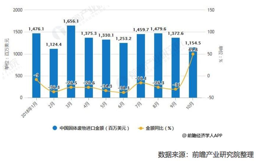 在進口金額方面,2018年8-9月中國固體廢物進口金額下降,2018年10月中國固體廢物進口金額維持下降趨勢。2018年10月中國固體廢物進口金額為1155百萬美元,同比增長49.8%。