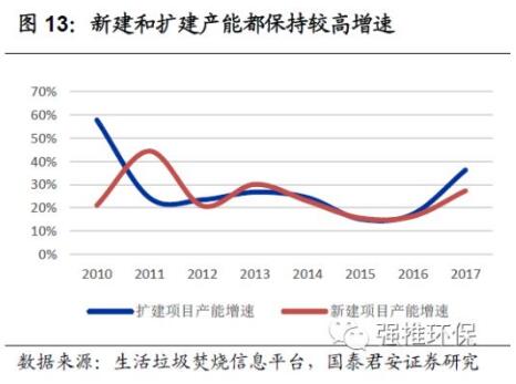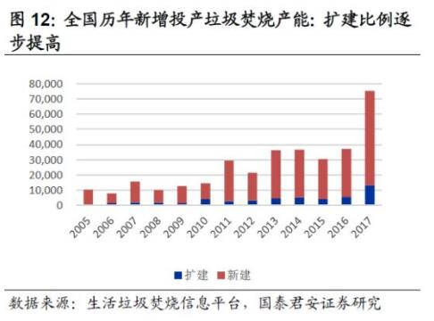 52%的已投運項目已經(jīng)或正在擴建。1)在已投運的362個項目中,其中175個為單體項目,187個已經(jīng)或正在二期及三期擴建。截止2018年上半年,仍有10萬噸/日的擴建項目正在建設中。這證明了我們的判斷,行業(yè)經(jīng)過多年的發(fā)展,隨著目前已建成的項目成熟運行及項目周邊垃圾處理需求量的增加,已有項目處于超負荷運轉(zhuǎn)狀態(tài),近幾年來進入擴建需求強烈的高峰期。2)2017年擴建項目產(chǎn)能增速達36%。
