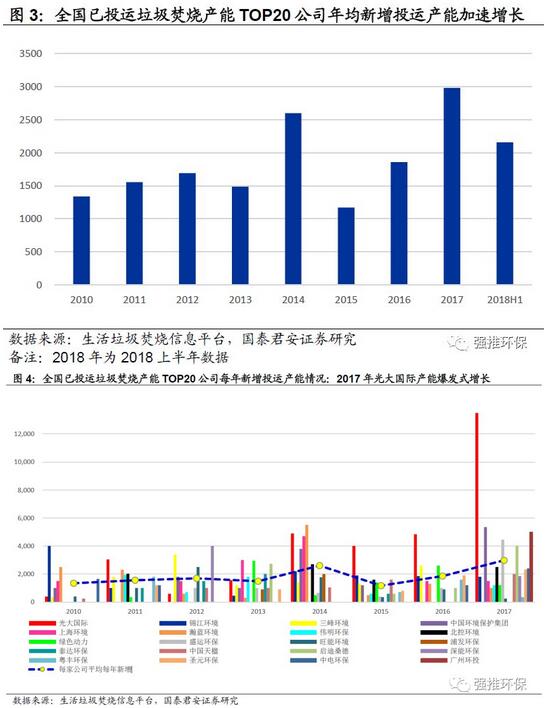 全國已投運垃圾焚燒產(chǎn)能TOP20公司年均新增投運產(chǎn)能加速增長:TOP20公司年均新增產(chǎn)能2011年為1339噸/日,到2017年為2981噸/日,僅2018年上半年就達2155噸/日,產(chǎn)能加速投放趨勢明顯。
