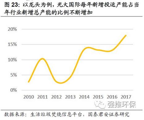 2017年,垃圾焚燒行業(yè)龍頭公司,光大國際新增垃圾焚燒產(chǎn)能占全行業(yè)當年新增焚燒產(chǎn)能的18%,占比自2012年以來持續(xù)提升。