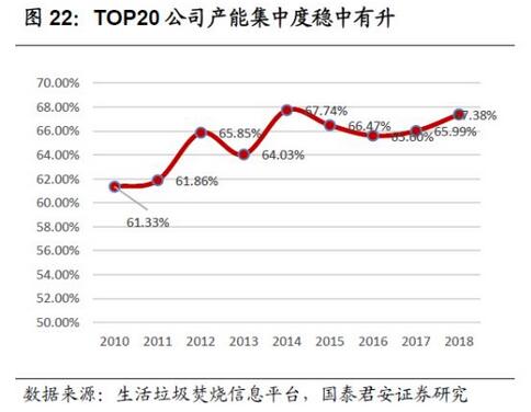 隨著環(huán)保標準和監(jiān)管趨嚴,具有品牌效應、運營經(jīng)驗、政府關系和資金實力的龍頭公司在拓展業(yè)務方面更具優(yōu)勢,預計行業(yè)集中度有進步一步提升趨勢。2010-2018上半年以來,行業(yè)中投產(chǎn)產(chǎn)能TOP20的公司合計投產(chǎn)占全行業(yè)總產(chǎn)能的比例由61%上升到67%。