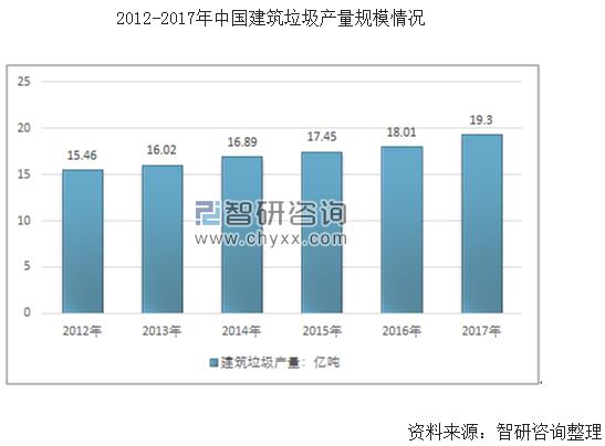 隨著城鎮(zhèn)化腳步的加速,每年我國(guó)有越來(lái)越多的建筑新建和重建,這些新建和重建的過(guò)程便會(huì)產(chǎn)生大量的建筑垃圾。由于建筑垃圾數(shù)據(jù)產(chǎn)量的統(tǒng)計(jì)存在較大難度,很少有國(guó)家建立起對(duì)建筑垃圾的統(tǒng)計(jì)體系,只能采取可獲得的數(shù)據(jù)進(jìn)行合理估計(jì)。智研咨詢發(fā)布的《2019-2025年中國(guó)建筑垃圾處理行業(yè)市場(chǎng)發(fā)展模式調(diào)研及投資趨勢(shì)分析研究報(bào)告》中顯示:2017年國(guó)內(nèi)建筑垃圾保守估計(jì)約19.3億噸,同比2016年的18.01億噸增長(zhǎng)了7.16%。
