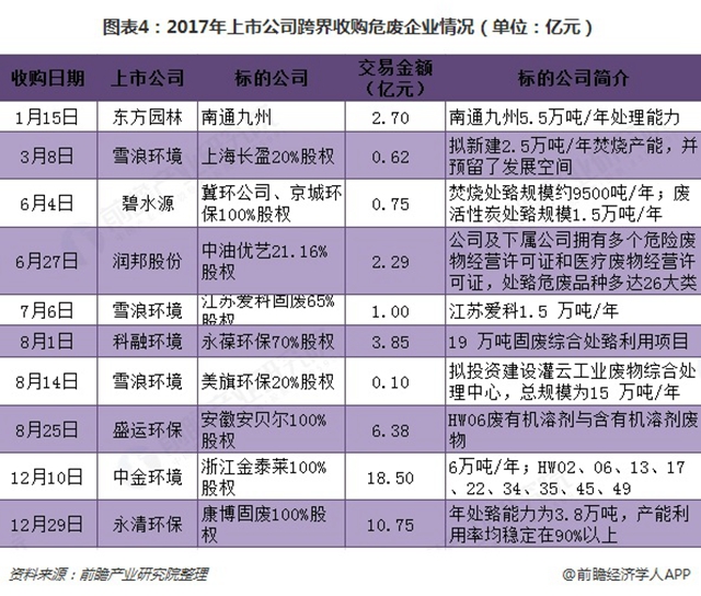 由于危廢處理處臵行業(yè)市場(chǎng)毛利率高,現(xiàn)金流好,且在未來(lái)的幾年間供需關(guān)系將持續(xù)緊張的大背景下,項(xiàng)目的盈利能力有進(jìn)一步提升的空間,因此具備資金和項(xiàng)目管理優(yōu)勢(shì)的上市環(huán)保公司出于產(chǎn)業(yè)布局和財(cái)務(wù)投資的角度,在最近兩年(特別是2017年后)通過(guò)并購(gòu)的方式大舉進(jìn)入危廢領(lǐng)域。