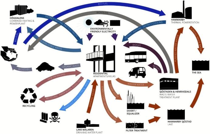其中,1996年由斯德哥爾摩水公司、Fortum (能源公司) 和城市廢物回收公司合作開發(fā)的哈馬碧生態(tài)模型至關(guān)重要。該模型的主要原理是最大程度地實(shí)現(xiàn)材料和能源流的局部閉環(huán)。它展示了如何將廢物回收、水、地區(qū)供暖供冷和交通,與城市規(guī)劃、景觀及建筑設(shè)計(jì)進(jìn)行整合, 最大限度地減少材料和能源的消耗。
