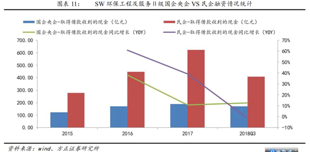 2018年民企融資陷入冰點(diǎn)。我們統(tǒng)計了SW環(huán)保工程及服務(wù)Ⅱ級公司的銀行借款情況,2018年前三季度國企和央企借款取得的現(xiàn)金規(guī)模171億元,同比增長13%;民營企業(yè)借款取得的現(xiàn)金規(guī)模407億元,同比下降2%??梢?,2018年國有企業(yè)從銀行借款未受到影響,但民營企業(yè)從銀行借款取得的現(xiàn)金規(guī)模明顯縮小。