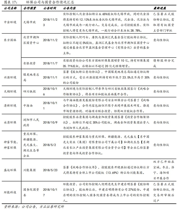 2018年5月至今,環(huán)保板塊已有神霧環(huán)保、盛運(yùn)環(huán)保、東方園林、環(huán)能科技、中金環(huán)境等民營企業(yè)公告將通過引入國企或政府資金作為戰(zhàn)略投資人或者出讓控股權(quán)保障企業(yè)持續(xù)經(jīng)營。