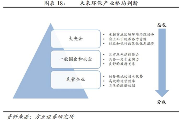 我們認(rèn)為環(huán)保產(chǎn)業(yè)將放棄之前的粗放式發(fā)展,進(jìn)入追求高質(zhì)量發(fā)展的階段。經(jīng)過2-3年的格局重塑,我們認(rèn)為未來行業(yè)格局將形成國企央企主導(dǎo)投資、民企專注細(xì)分市場技術(shù)的新格局。