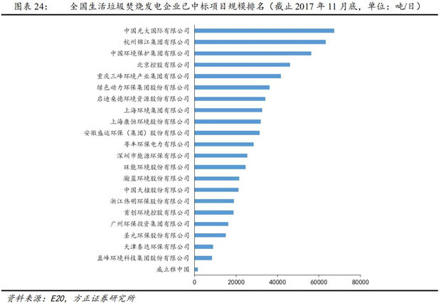 根據(jù)E20研究院統(tǒng)計排名,截止2017年11月底,已中標(biāo)的垃圾焚燒發(fā)電項(xiàng)目規(guī)模前五企業(yè)項(xiàng)目規(guī)模占比達(dá)到 42.26%,規(guī)模前十企業(yè)項(xiàng)目規(guī)模占比達(dá)到67.86%,行業(yè)市場集中度較高。