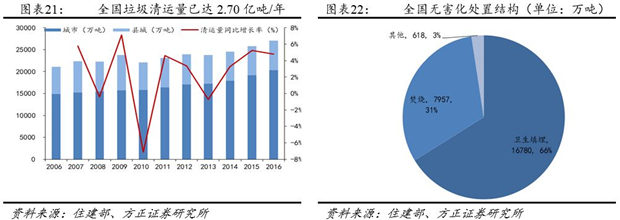 根據(jù)2016年住建部統(tǒng)計年鑒,目前我國生活垃圾年清運(yùn)量2.70億噸,無害化處置率約94%。無害化處置中,填埋、焚燒、其他的比例分別為66%、31%和3%,填埋仍是無害化處置的主流方式。