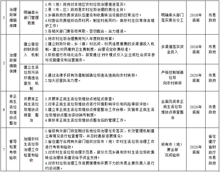 (一)制定農(nóng)村生活垃圾治理方案。各市(地)、縣(市、區(qū))要結(jié)合實(shí)際,堅(jiān)持按照“統(tǒng)籌考慮、分類(lèi)指導(dǎo)、經(jīng)濟(jì)適用、保證效果”的原則,制定本地區(qū)農(nóng)村生活垃圾治理三年行動(dòng)方案。方案要重點(diǎn)確定農(nóng)村生活垃圾處理目標(biāo)任務(wù)、資金投入、責(zé)任部門(mén)和保障措施,合理選擇收運(yùn)處置模式和技術(shù)路線,明確各階段垃圾治理工作重點(diǎn),細(xì)化年度建設(shè)任務(wù)。各縣(市、區(qū))制定方案后,要組織編制本地區(qū)農(nóng)村生活垃圾治理設(shè)施建設(shè)專(zhuān)項(xiàng)規(guī)劃方案,充分考慮空間居民點(diǎn)布局調(diào)整和環(huán)境影響因素,科學(xué)確定整治村范圍、收集轉(zhuǎn)運(yùn)處理設(shè)施布局和建設(shè)規(guī)模,并經(jīng)專(zhuān)家論證通過(guò)后實(shí)施。各市縣《農(nóng)村生活垃圾治理方案》于2019年3月底前報(bào)省住建廳備案。