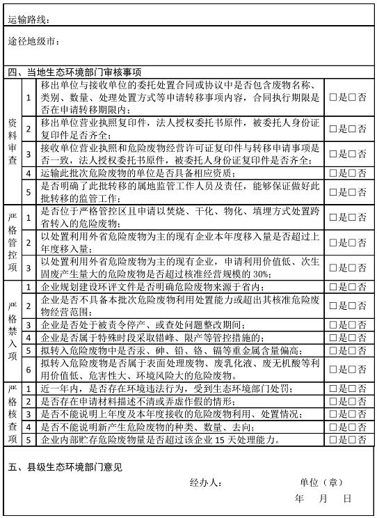 (三)對于具備條件接收跨省轉入危險廢物的,相關市、縣(市、區(qū))生態(tài)環(huán)境部門要嚴格核查并出具核查意見。接收單位存在下述情形之一的,市級生態(tài)環(huán)境局不得出具同意接收的意見: