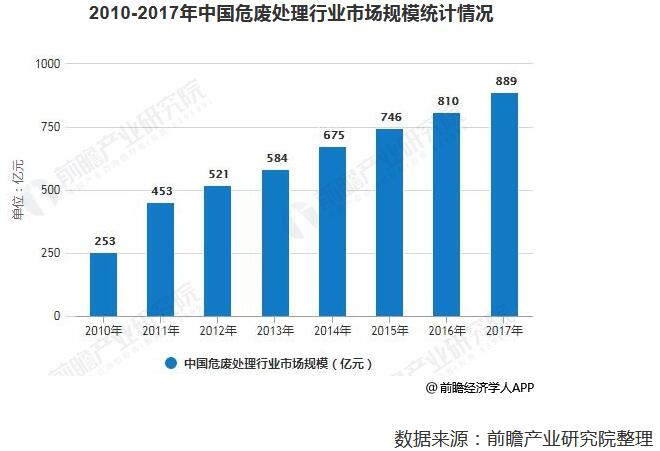 我國(guó)危廢處理行業(yè)自2001年左右起步,經(jīng)過十多年的發(fā)展,行業(yè)進(jìn)入快速增長(zhǎng)階段,但也存在經(jīng)驗(yàn)和技術(shù)上的短板。由于我國(guó)危廢整體處置率較低,使得行業(yè)市場(chǎng)規(guī)模較小。據(jù)前瞻產(chǎn)業(yè)研究院發(fā)布的《中國(guó)危廢處理行業(yè)市場(chǎng)前瞻與投資戰(zhàn)略規(guī)劃分析報(bào)告》統(tǒng)計(jì)數(shù)據(jù)顯示,2010年中國(guó)危廢處理行業(yè)市場(chǎng)規(guī)模僅僅為253億元,2011年中國(guó)危廢處理行業(yè)市場(chǎng)規(guī)模增長(zhǎng)至453億元。之后一直保持平穩(wěn)增長(zhǎng),到了2016年中國(guó)危廢處理行業(yè)市場(chǎng)規(guī)模突破800億元,截止到2017年中國(guó)危廢處理行業(yè)市場(chǎng)規(guī)模達(dá)到了約889億元。