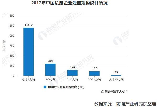 正因此,我國(guó)危廢處理行業(yè)參與者較多,但企業(yè)規(guī)模普遍較小。根據(jù)2017年7月的數(shù)據(jù)統(tǒng)計(jì),我國(guó)危廢處理企業(yè)產(chǎn)能低于2萬噸、2-5萬噸、5-10萬噸、10-25萬噸和25萬噸以上的企業(yè)數(shù)量分別為1210家、307家、147家、120家和25家,67%的企業(yè)危廢處理產(chǎn)能低于2萬噸。
