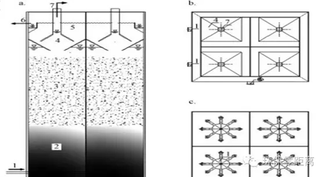 圖 2 UASB反應器示意圖(a.剖視圖, b.頂視圖, c.底視圖; 1.進水, 2.污泥層, 3.懸浮層, 4.三相分離器, 5.沉淀區(qū), 6.出水, 7.氣體)