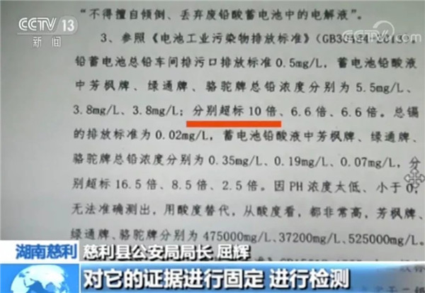 今年2月到9月,湖南省、廣東省等多家第三方檢測中心傳來消息,警方在案發(fā)現(xiàn)場抽取的非法排放的鉛酸液,最高超過國家《電池工業(yè)污染排放標準》的10倍;對案發(fā)現(xiàn)場內(nèi)廁所蹲坑周邊土壤布點采樣,發(fā)現(xiàn)土壤存在重金屬鉛超標。