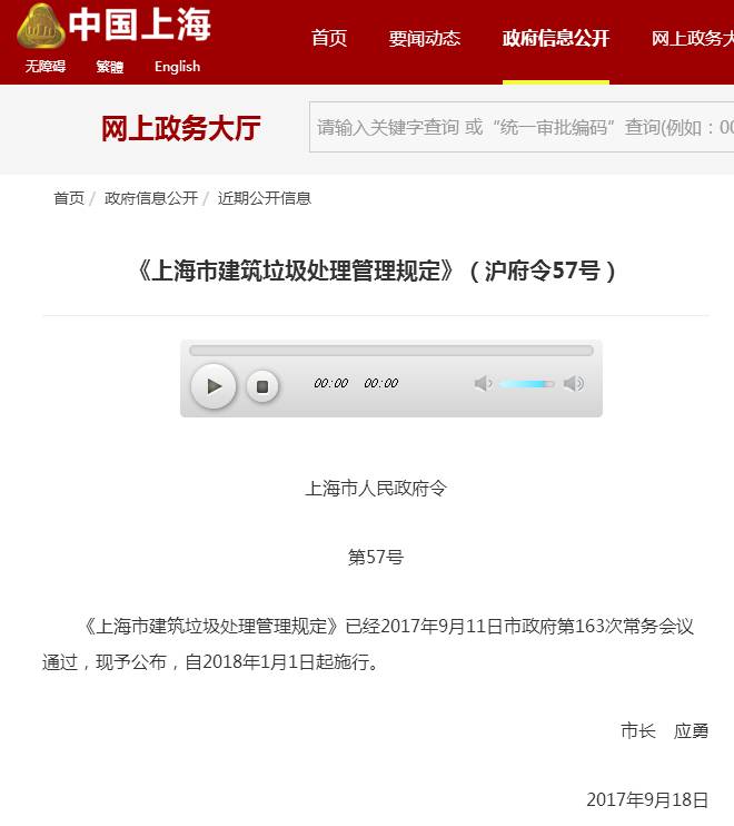 《上海市建筑垃圾處理管理規(guī)定》已經(jīng)2017年9月11日市政府第163次常務(wù)會(huì)議通過(guò),現(xiàn)予公布,自2018年1月1日起施行。