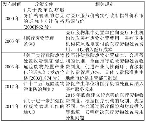 2003 年“非典”發(fā)生之后,國務院頒布了《醫(yī)療廢物管理條例》,批復實施了《全國危險廢物和醫(yī)療廢物集中處置設施建設規(guī)劃》(以下簡稱《規(guī)劃》),確立了以地級城市為單位建設醫(yī)療廢物集中處置設施的格局。五部委同期聯(lián)合發(fā)布的《關于實行危險廢物處置收費制度 促進危險廢物處置產(chǎn)業(yè)化的通知》(以下簡稱《通知》)開啟了我國醫(yī)療廢物有償處置服務的序幕。醫(yī)療廢物處置收費政策是醫(yī)療廢物處置企業(yè)得以生存和發(fā)展的經(jīng)濟保障,是國家促進醫(yī)療廢物處置產(chǎn)業(yè)化發(fā)展的重要經(jīng)濟政策之一。系統(tǒng)梳理我國醫(yī)療廢物收費政策的發(fā)展歷程及實施現(xiàn)狀,深入剖析其存在的問題,有助于配合新時期醫(yī)療廢物處置行業(yè)調整升級,促進行業(yè)可持續(xù)發(fā)展。
