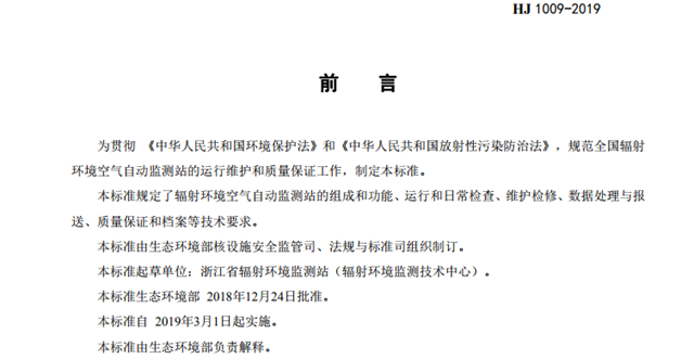 為貫徹《中華人民共和國環(huán)境保護(hù)法》《中華人民共和國放射性污染防治法》,規(guī)范輻射環(huán)境空氣自動監(jiān)測站運行維護(hù)和質(zhì)量保證工作,現(xiàn)批準(zhǔn)《輻射環(huán)境空氣自動監(jiān)測站運行技術(shù)規(guī)范》為國家環(huán)境保護(hù)標(biāo)準(zhǔn),并予發(fā)布。