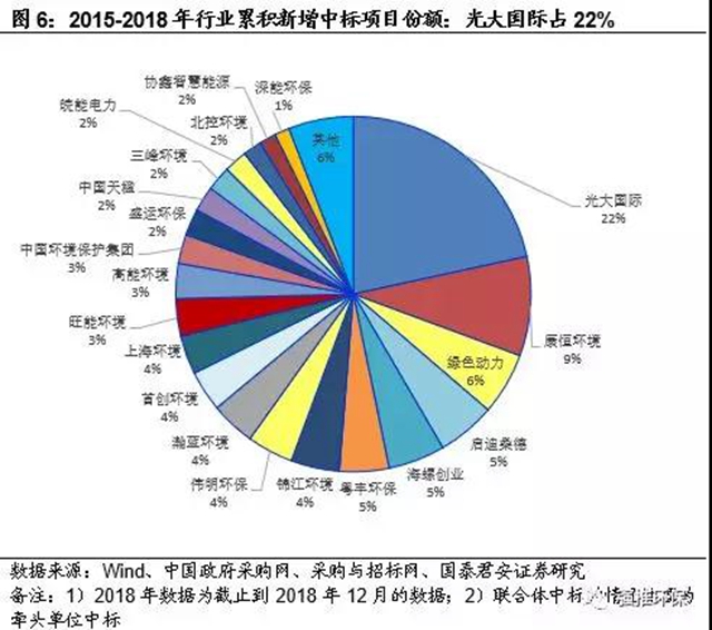 新增中標(biāo)項目向龍頭公司集中。分公司來看,2015-2018年行業(yè)新增項目總產(chǎn)能前三的公司分別為光大國際、康恒環(huán)境、綠色動力,分別占有新增中標(biāo)項目總量的22%、9%、6%。