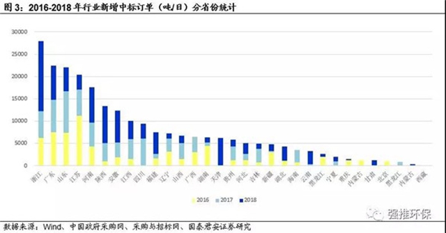 2016-2018年,浙江、廣東、山東、江蘇為新增項目最多的前四個省份,新中標(biāo)項目分別達(dá)到了2.8、2.2、2.2、2萬噸/日的規(guī)模,這還不包括部分未經(jīng)過招標(biāo)程序的擴建項目。