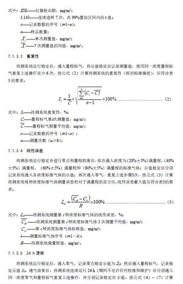 待測系統(tǒng)運(yùn)行穩(wěn)定后,通入接近檢出限的零氣或除烴空氣加標(biāo)樣品,待示值穩(wěn)定后連續(xù)測量7 次,記錄每次測得濃度值,計算所取得數(shù)據(jù)的標(biāo)準(zhǔn)偏差,以3.143 倍標(biāo)準(zhǔn)偏差表示儀器檢出限,按公式(1)計算,應(yīng)符合表3 的要求: