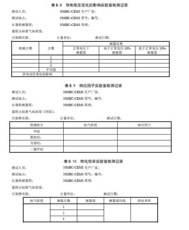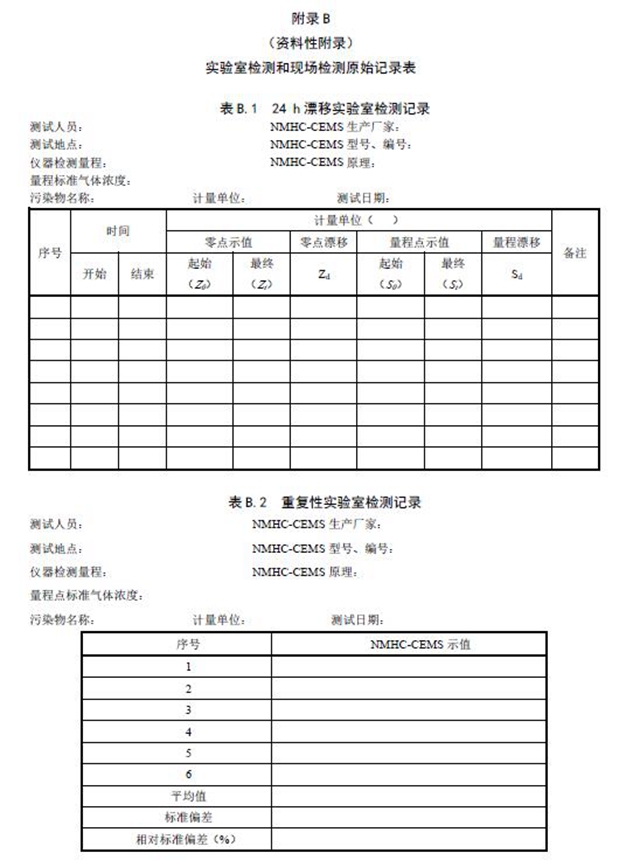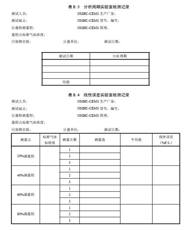 固定污染源廢氣NMHC-CEMS 實(shí)驗(yàn)室檢測項(xiàng)目見表3 和表4,廢氣參數(shù)現(xiàn)場檢測項(xiàng)目見表5。相關(guān)記錄表格見附錄B。