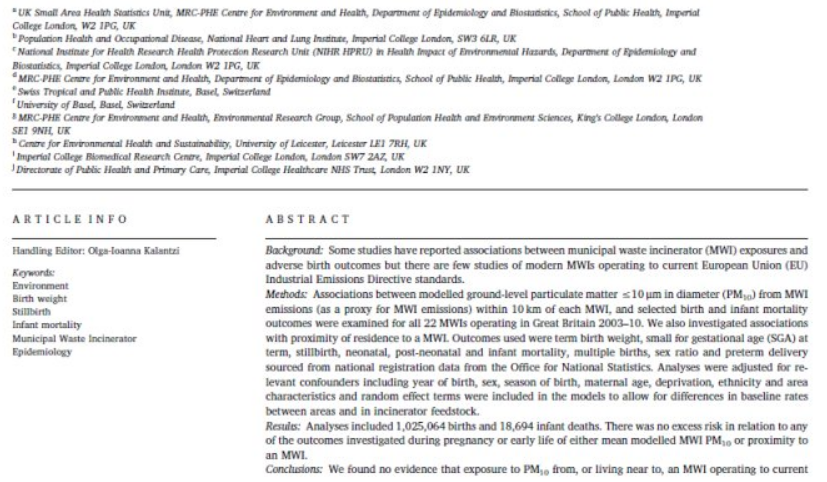 該研究由英國公共衛(wèi)生部門,英國大學和公共機構資助,分析了2003—2010年間在英國運營的主要生活垃圾焚燒廠(MWI)排放的PM10潛在影響(這些焚燒廠達到歐盟標準運行)。研究項目評估了生活垃圾焚燒廠附近新生兒數量超過100萬,評估參數包括:出生體重,足月胎齡,死胎,新生兒,新生兒和嬰兒死亡率,多胞胎,性別比和早產。