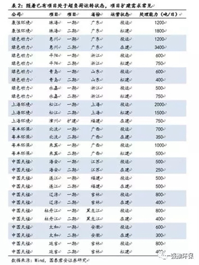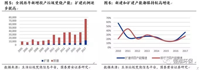 在已投運(yùn)的362個(gè)項(xiàng)目中,其中175個(gè)為單體項(xiàng)目,187個(gè)已經(jīng)或正在二期及三期擴(kuò)建。截止2018上半年,仍有10萬(wàn)噸/日的擴(kuò)建項(xiàng)目正在建設(shè)中。這證明了我們的判斷,行業(yè)經(jīng)過(guò)多年的發(fā)展,隨著目前已建成的項(xiàng)目成熟運(yùn)行及項(xiàng)目周邊垃圾處理需求量的增加,已有項(xiàng)目處于超負(fù)荷運(yùn)轉(zhuǎn)狀態(tài),近幾年來(lái)進(jìn)入擴(kuò)建需求強(qiáng)烈的高峰期。