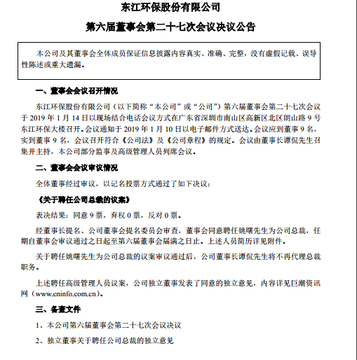 東江環(huán)保公告,經(jīng)董事長(zhǎng)提名、公司董事會(huì)提名委員會(huì)審查,董事會(huì)同意聘任姚曙為公司總裁,任期自董事會(huì)審議通過之日起至第六屆董事會(huì)屆滿之日止。關(guān)于聘任姚曙為公司總裁的議案審議通過后,公司董事長(zhǎng)譚侃將不再代理總裁職務(wù)。