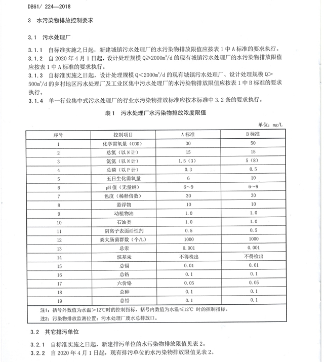 《陜西省黃河流域污水綜合排放標(biāo)準(zhǔn)》(修訂版)印發(fā),將于2019年1月29日施行。原標(biāo)準(zhǔn)于2011年4月發(fā)布,5月1日起實(shí)施。此次修訂提高了污染物排放控制要求,加嚴(yán)了設(shè)計(jì)處理規(guī)模大于2000立方米/天的城鎮(zhèn)污水處理廠主要污染指標(biāo)限值,與《地表水環(huán)境質(zhì)量標(biāo)準(zhǔn)》(GB3838-2002)中IV類(lèi)標(biāo)準(zhǔn)限值一致;對(duì)于一般工業(yè)企業(yè)水污染物排放標(biāo)準(zhǔn)略作調(diào)整,適當(dāng)加嚴(yán)氨氮、總氮、石油類(lèi)三項(xiàng)污染物排放限值。