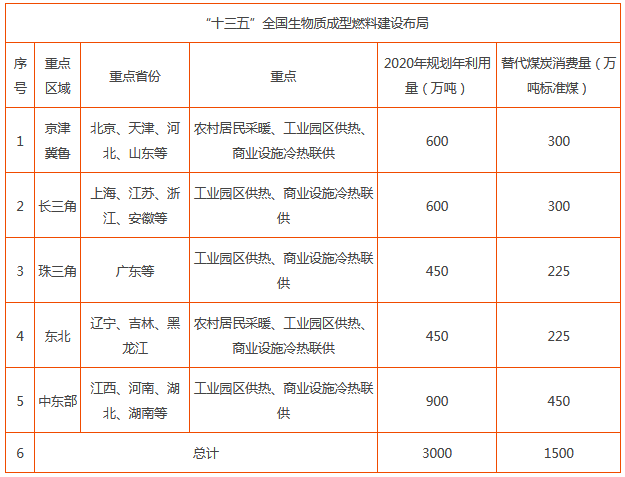 在具備資源和市場(chǎng)條件的地區(qū),特別是在大氣污染形勢(shì)嚴(yán)峻、淘汰燃煤鍋爐任務(wù)較重的京津冀魯、長(zhǎng)三角、珠三角、東北等區(qū)域,以及散煤消費(fèi)較多的農(nóng)村地區(qū),加快推廣生物質(zhì)成型燃料鍋爐供熱,為村鎮(zhèn)、工業(yè)園區(qū)及公共和商業(yè)設(shè)施提供可再生清潔熱力。