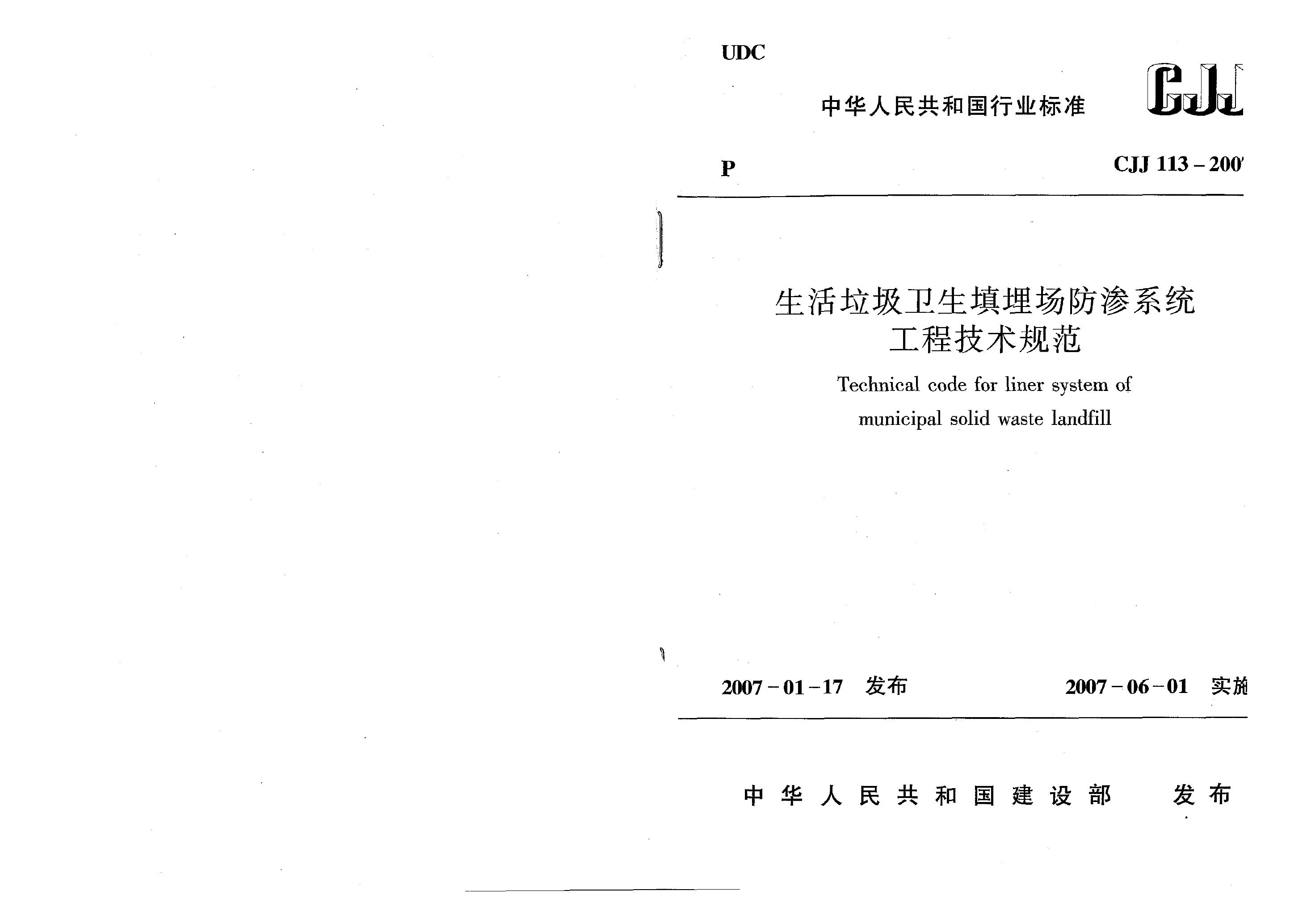 生活垃圾衛(wèi)生填埋場防滲系統(tǒng)工程技術(shù)規(guī)范(CJJ 113-2007)