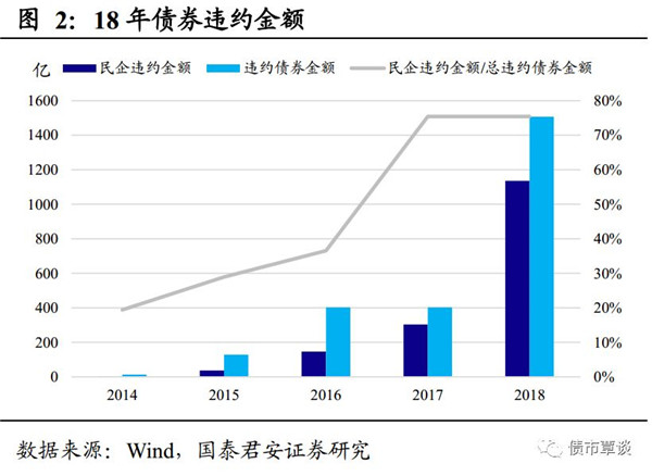 信用債市場(chǎng)出現(xiàn)大規(guī)模違約潮,共165只債券出現(xiàn)違約,總涉及金額1506.84億元,比2014-2017年4年違約債券金額總和還要多。而且本輪違約潮的主力軍是民營(yíng)企業(yè),在18年違約的債券中,發(fā)行人為民企的債券有126只,占違約債券總數(shù)的76.36%,涉及金額1136.19億元。事實(shí)上,在2016年也出現(xiàn)過(guò)類似的由于信用政策收緊而引發(fā)的違約潮,但相較于16年的違約事件,本輪違約潮的特征有所不同。