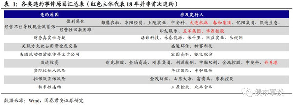 從2018年的民企違約案例來(lái)看,最終導(dǎo)致民企違約的因素大致分為以下幾類:經(jīng)營(yíng)不佳導(dǎo)致現(xiàn)金流緊張、涉嫌財(cái)務(wù)造假、關(guān)聯(lián)交易、集團(tuán)流動(dòng)性緊張傳導(dǎo)至子公司、短債長(zhǎng)投激進(jìn)投資、實(shí)際控制人風(fēng)險(xiǎn)、擔(dān)保及互保風(fēng)險(xiǎn)和技術(shù)性違約。